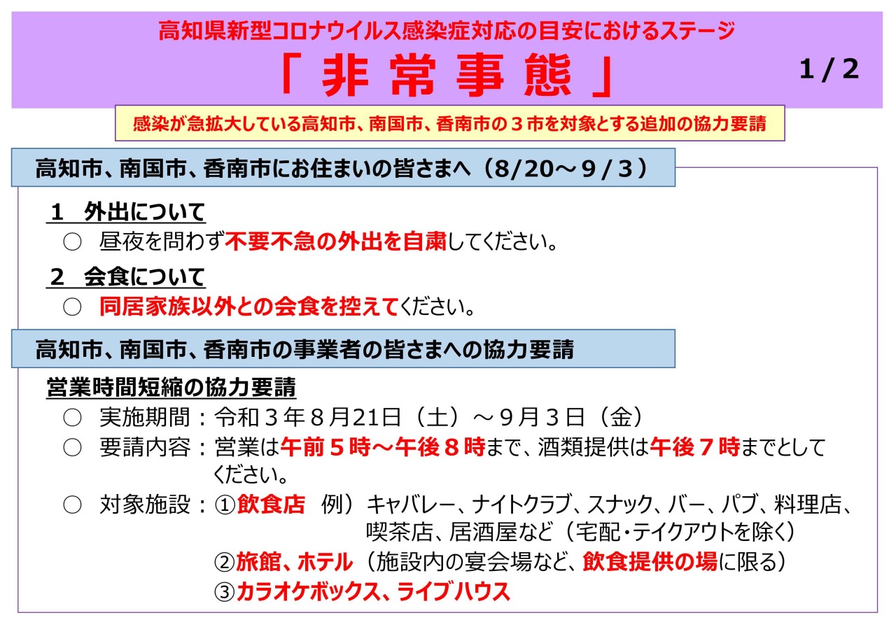 この度、新型コロナウイルス感染拡大における高知市の営業時間短縮要請に伴いまして、下記の通り営業時間の変更をさせていただくこととなりました。
